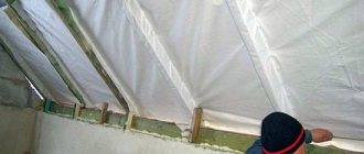 Както вече разбрахте, изолацията на студеното таванско помещение на частна къща с минерална вата се извършва чрез полагане на топлоизолация между носещите греди директно върху грубия таван на първия етаж. Поради високата хигроскопичност на минералната вата е необходимо да се използва пароизолационен филм. По принцип може да се използва дори обикновен полиетилен. Няма да има специални натоварвания върху филма и при внимателен монтаж той няма да се скъса. За да сте напълно уверени в надеждността на защитния слой, трябва да използвате полипропиленова пароизолация, подсилена с мрежа от фибростъкло.