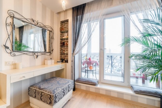 Важно! За да се поддържа ефектът от голямо пространство, експертите препоръчват използването на полупрозрачни завеси, както и въздушни завеси, оборудвани с повдигащ механизъм