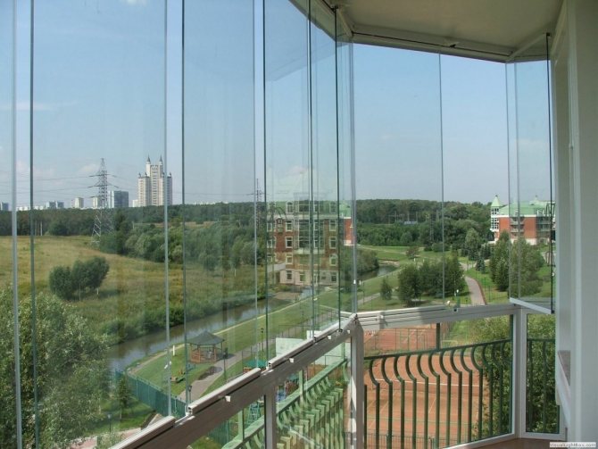 - Визуално увеличаване на площта. Прозрачното стъкло изглежда леко в сравнение с конвенционалните облицовки на балкона. Течащи по цялата височина и ширина на външната стена, те несъмнено визуално разширяват пространството.