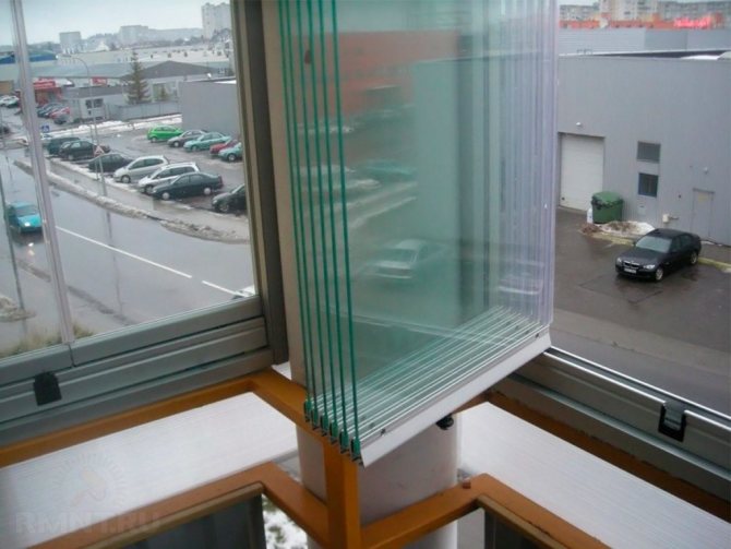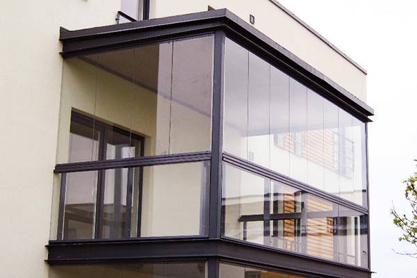 Специални закалени стъкла са монтирани на ролкови водачи отгоре и отдолу, след това фиксирани един към друг и отстрани. Вратите се отварят към вътрешността на балкона или се движат като акордеон.
