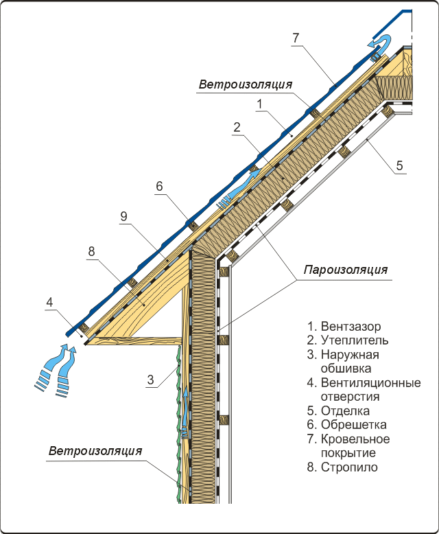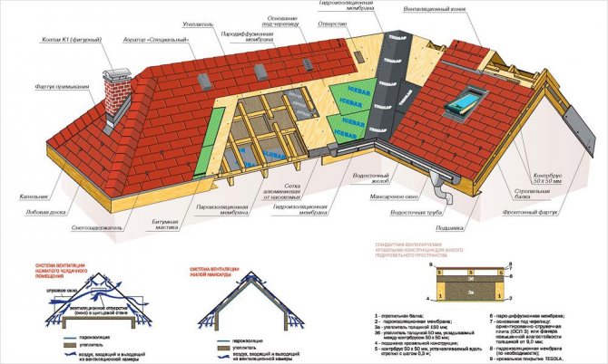 Мансардният покрив трябва да бъде изолиран, а изолацията и дървените конструкции имат способността да абсорбират влагата от въздуха. Няма да работи за проветряването им отдолу, отстрани на помещенията, въздухът там е по-влажен, отколкото отвън. Напротив, отвътре покривът трябва да бъде защитен от влага, като покрива гредите с пароизолационен филм. Единственият начин да предотвратите влажността на дървесината и минералната вата е да се осигури тяхната вентилация отвън, не забравяйте да оставите вентилирана въздушна междина с височина най-малко 4 см между покрива и покривния филм. изолацията няма да осигури отделянето на водни пари, поради което за мансардни покриви се използва само паропропусклива вятърна и влага изолация (дифузионна мембрана).