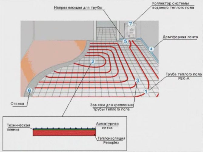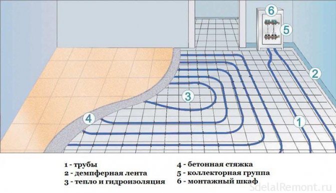 Нагревателният му елемент са тръби с гореща вода в тях. За да се създаде подобен самонивелиращ се под на топъл под, тези елементи просто се изсипват с бетон или върху тях се прави настилка. Но в този случай ще трябва да инсталирате и специални водачи.
