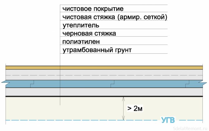 Първият слой се извършва върху грубата основа. Използва се главно за създаване на равна повърхност за последващо полагане на материали. По принцип този слой е подходящ за всички повърхности, които имат дори незначителни ефекти. Вместо груб слой за изолация може да се използва подова плоча или почва, подготвена по всички правила.