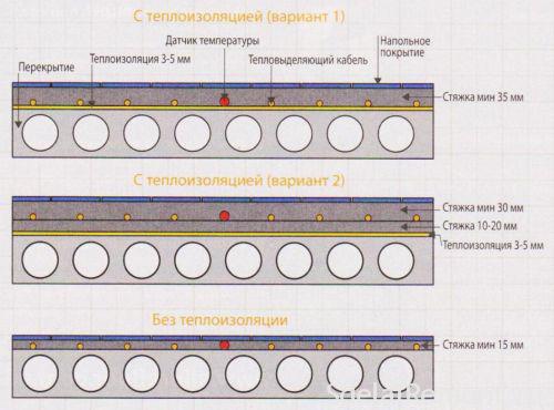 В зависимост от използваната отоплителна система, топлият под под саморазливния под може да бъде както следва: