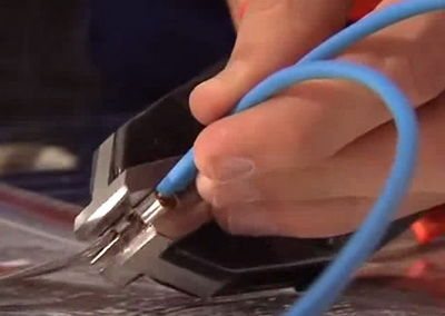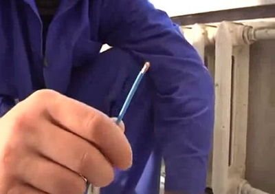 Оголеният край на проводника се вкарва в отвора на скобата, затегнат с клещи.