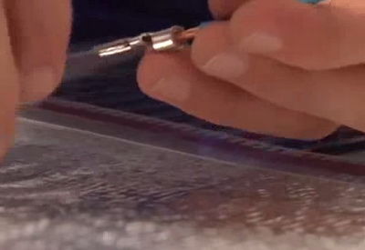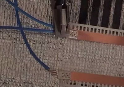 Скобата се вкарва под медното фолио и се затяга с клещи.
