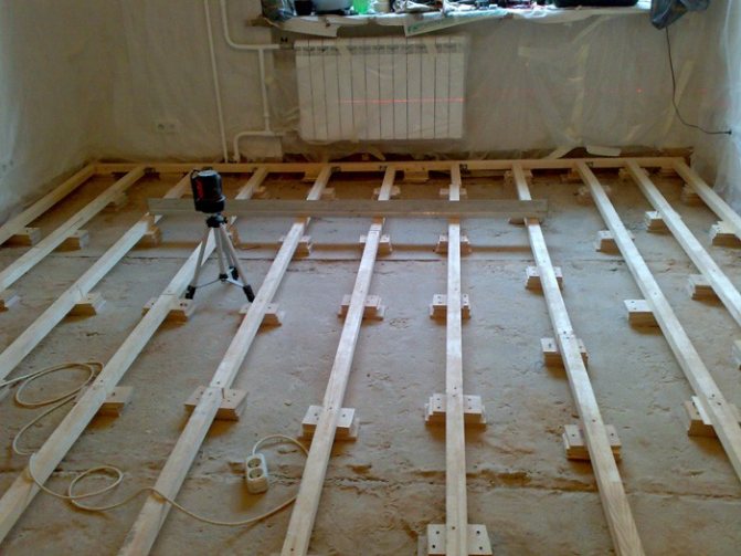Върху бетонния под се поставят трупи, които служат като основа за окончателното подово покритие. Дъските трябва да са с дължина повече от 2 м. Ако трупите са по-къси от необходимото, за да покрият напълно основата, трябва да ги съедините с краищата им. Когато свързвате лаговете, трябва да обърнете внимание, така че местоположението на съседните фуги да се различава от фугите на съседните пръти с поне 50 cm.