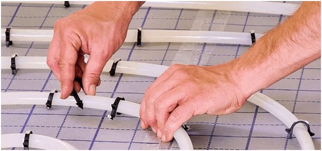- След това започват да полагат металопластикови тръби по схемата "змия" или "охлюв", като ги разпределят между шефовете и поддържат разстоянието, предвидено в проекта. От това зависи мощността и интензивността на отоплението. За по-добро фиксиране на завоя на тръбата използвайте специален пружинен приспособление.