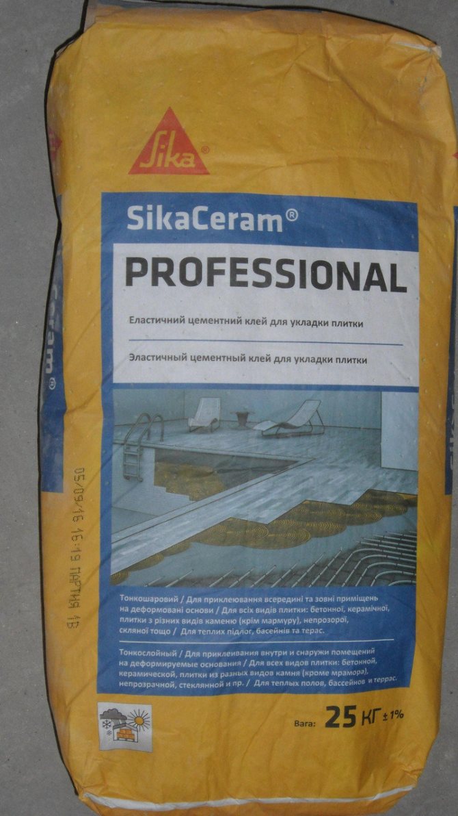 Основата на лепилото за плочки може да бъде цимент. Разрежда се с вода в определени пропорции; те са посочени на опаковката. Сместа се приготвя непосредствено преди нанасяне върху основата.