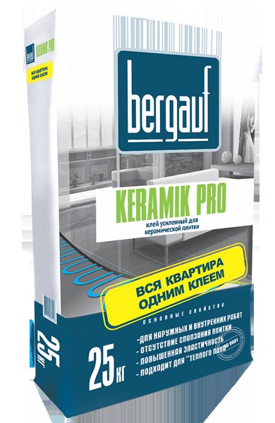 - Bergauf Keramik PRO се приготвя на циментово-пясъчна основа. Шевът е еластичен, устойчив на влага, способен да побере големи плочки. Издържа на температурни спадове от порядъка на -50 - +70 градуса. Осигурено е нанасяне в дебел слой. Времето за корекция е до 20 минути. Страна износител Германия.