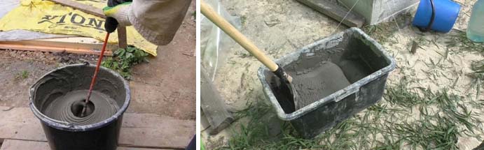 - Разредете лепилото за плочки и нанесете върху малка площ от бетонната настилка.