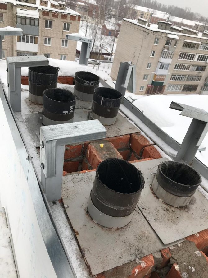 - Ако височината на външната зидария на комина е 1,2 метра или повече, тогава преди да инсталирате аспиратора, трябва фиксирайте тръбата с покривни скоби.