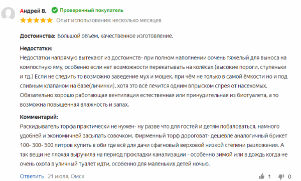 В торфената тоалетна Piteco 905 добри отзиви от летни жители... Най-често към стандартния комплект се поръчват капачка с мухорешетка, допълнителна вентилационна тръба и торфена смес.