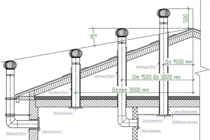 - Разрезът на вентилационната тръба, като се вземе предвид аспираторът, трябва да бъде най-малко един метър над покрива на помещението;