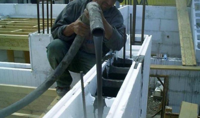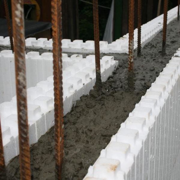 - На всеки три слоя експандиран полистирол, бетонът се излива и изсушава. Честотата на изливане на бетон се обяснява с необходимостта да се запълнят всички кухини, без празнини. За същата цел използвайте специален вибратор за бетон, той ще ви помогне да премахнете въздушните мехурчета от сместа, равномерно разпределете бетона и уплътнете пълнежа му.