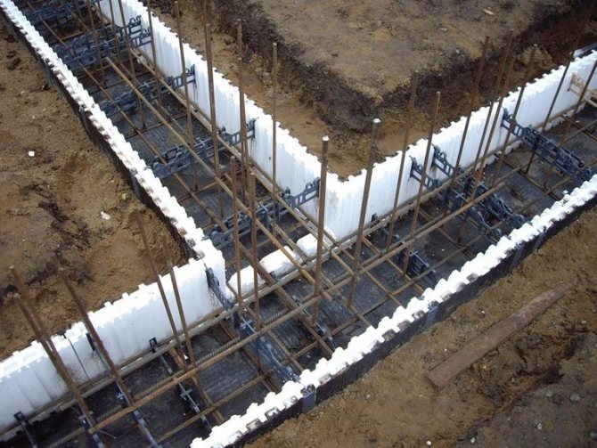Общият принцип за изграждане на кофраж от полистирол или експандиран полистирол е същият като при дървените или металните конструкции. Основната разлика е, че вместо метални или дървени дъски, в основата на кофража се използват листове от експандиран полистирол с висока плътност. За разлика от готовите блокове, от които стената на сградата се сгъва и излива с бетон, за фундамента се използва кофраж от пяна от пластмаса под формата на чифт плочи, закрепени заедно с метални дистанционни елементи. Достатъчно е да инсталирате такава двойка в подготвения изкоп, подравнете и фиксирайте.