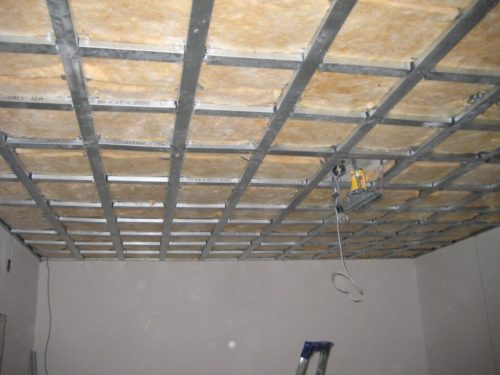 - щайгата на няколко метални водещи профила е фиксирана със стоманени самонарезни винтове, те здраво фиксират минералната вата на тавана;