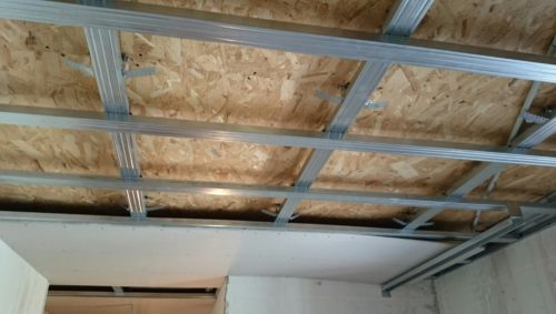 За да се създаде рамка от напречно и надлъжно разположени профили, се правят клетки, като се прикрепват към тавана с пирони, дюбели или винтове.