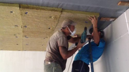 - В процеса на фиксиране на минералната вата към тавана има пукнатини и фуги, които се запълват с полиуретанова пяна.