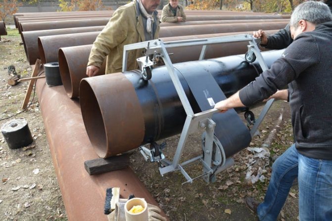 Предварително загрятата тръба е обвита с полиетиленова лента