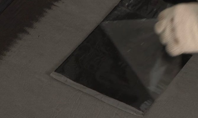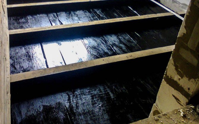 | Нанесете мастика на основата на битум върху дървения под, стените на височина 20-25 сантиметра.За да изпълните работата, използвайте валяк или четка (специална четка). След 4-6 часа след нанасяне на първия слой, нанесете втория. В този случай ролката трябва да бъде преместена в обратна посока. В процеса на сушене на разтвора е необходимо да се изключи навлизането на прах и мръсотия върху него. |