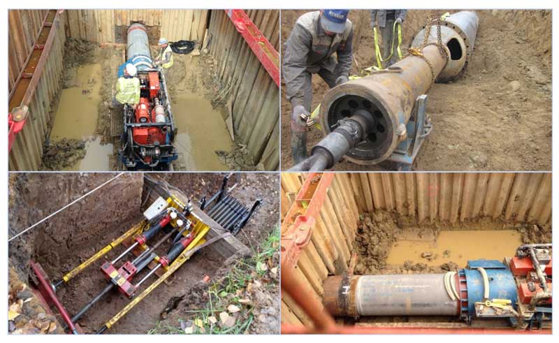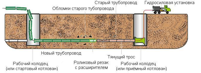 При подмяна на тръби, нов участък на тръбопровода с пневматичен перфоратор, монтиран в задния край, се свързва с отстранения, а старата тръба, когато излиза в приемната яма, се отрязва и отстранява.