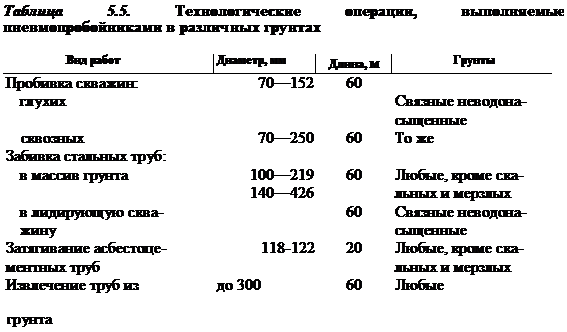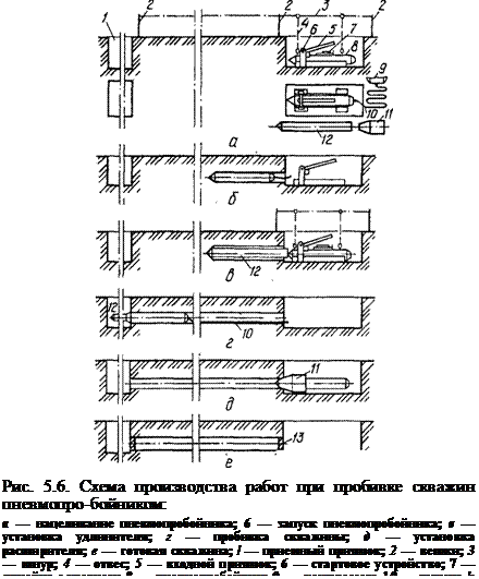 Технологични операции „при пробиване на кладенци с пневматични щанци (фиг. 5.6) започват с проникването му в земята от изходната яма по посока на приемната яма. При движение пневматичният перфоратор с коничния си преден край уплътнява почвата, изтласквайки я в страни и оформя кладенец. За възприемане на реактивни сили по време на стартиране на машината от ямата се използват пускови устройства, които създават сили на триене върху корпуса на пневматичния перфоратор или избутват машината на дъното. Освен това, за да се улесни въвеждането на пневматичния перфоратор в земята, изстрелването се извършва при понижено налягане (0,3-0,4 MPa) на сгъстен въздух.