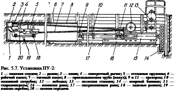За пробиване на тръбопроводи са най-ефективни инсталации с механизирана разработка и отстраняване на почвата като SKV Glavmosstroy и PU-2, проектирани от TsNIIpodzemmash (виж Таблица 5.3). Инсталацията PU-2 се състои от четири части: захранващ блок, работно тяло, устройство за предаване на силите на натиск и ножова секция (фиг. 5.7). Технологичните операции, използващи инсталацията PU-2, се извършват в следната последователност. Първата връзка на корпуса с монтирана в края му секция с нож и система за отклоняващи ролки е положена върху направляващата рамка, поставена в ямата. След проверка на правилната посока на уплътнението, работен орган се въвежда в равнината на връзката и въжетата се съхраняват. След това се включват хидравличните крикове, които изтласкват главната кръстосана глава под налягане напред, докато тя докосне крайната повърхност на полагащия се корпус. При по-нататъшно движение на траверса предният край на корпуса е леко притиснат в земята. След това подаването на кожуха се спира и работното тяло се изтегля с помощта на работното въже, докато режещият ръб на кофата докосне дъното. По-нататъшното издърпване на въжето е придружено от преместване на работното тяло напред и завъртане на кофата отгоре надолу.