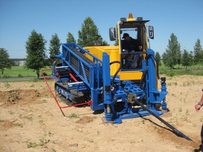 Фокусирайки се върху по-голяма ефективност, ние най-често използваме инсталация UVVGP-400 дизайни на VNIIGS. Принципът на действие е следният: корпус с накрайник от едната страна, а другата страна е поставена в ударната част на вибрационния чук. Подчинявайки се на ударни импулси, поддържани от статично вдлъбнатина с товарен повдигател, тръбата се движи в земята.