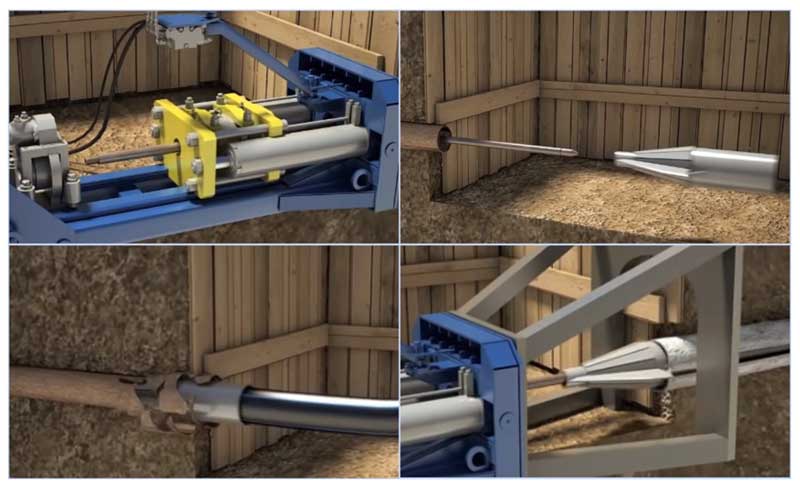- С помощта на специален механизъм на хидравлични крикове, металните пръти се усукват и подават в канала, като ги избутват, докато излязат от линията в приемната яма.