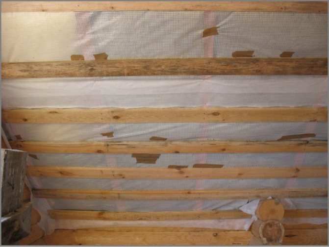 Лист от минерална вата се полага между припокриващите се изоставания. За фиксиране в това положение направете тънка рамка от канап... Те просто го закрепват с телбод към изоставанията. Това е необходимо, за да може, когато пароизолацията се изтегли и закрепи към трупите, минералната вата да не се плъзне надолу.След това се пълнят лента от 20 х 30 мм и листове от гипсокартон, облицовка и друг материал.