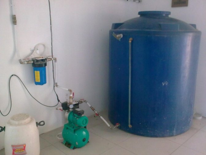 - с помощта на помпа водата влиза в резервоар за съхранение, монтиран на кота;