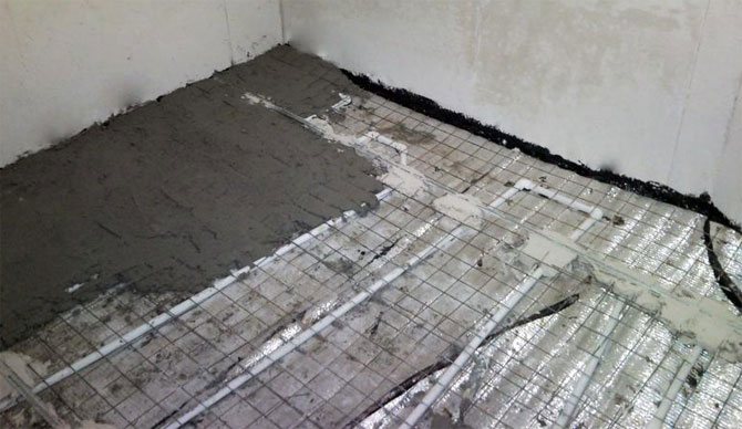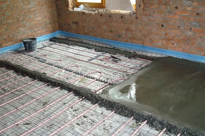 Преди окончателното изливане на подготвената система за бетонна замазка е необходимо отново да се провери херметичността на всички продукти и преходи. Не забравяйте да оставите разширителните фуги в замазката, така че тръбите да могат свободно да се разширяват по време на нагряване.