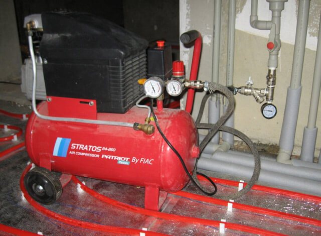Процедурата за кримпване на системата за подово отопление с въздух се извършва, когато не е възможно да се тестват с вода. За създаване на излишно налягане се използва подов компресор, автомобилна помпа или пръскачка с манометър. Технологията за пресоване на въздуха се прилага по следния начин: