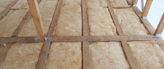 - Монтираме топлоизолация (минерална вата, експандиран полистирол, полистирол). Уверяваме се, че няма пролуки между трупите и изолацията. Ако въпреки това се е образувало пространство, ние го запълваме с полиуретанова пяна.