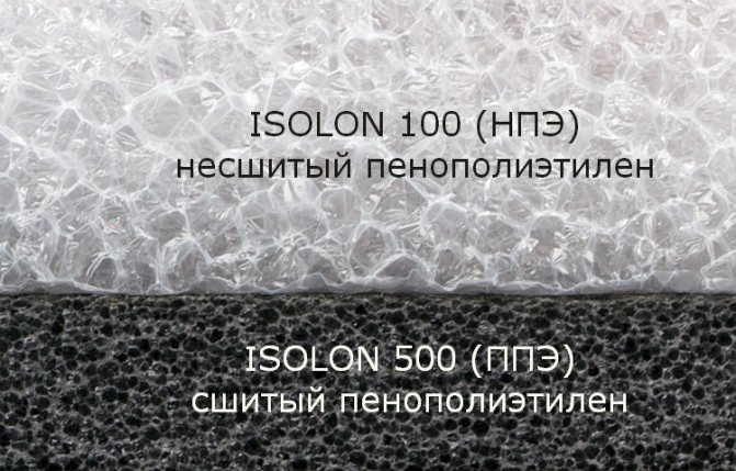 - Физически омрежена (FS-PPE). Материалът не съдържа омрежващи добавки и вместо първия етап на топлинна обработка, заготовката на матрицата се обработва с електронен поток, който инициира процеса на омрежване. Възможността за контрол на броя на омрежванията ви позволява да променяте характеристиките на материала и размера на клетките.