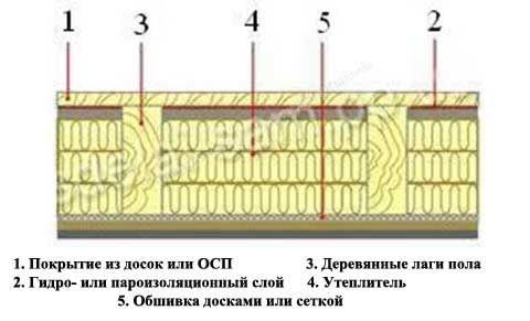 - След това пространството между изоставащите се запълва с топлоизолационен материал възможно най-плътно. В този случай е необходимо също така да се осигури малка междина, така че подовите настилки да не лежат директно върху изолацията.
