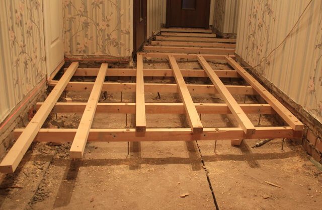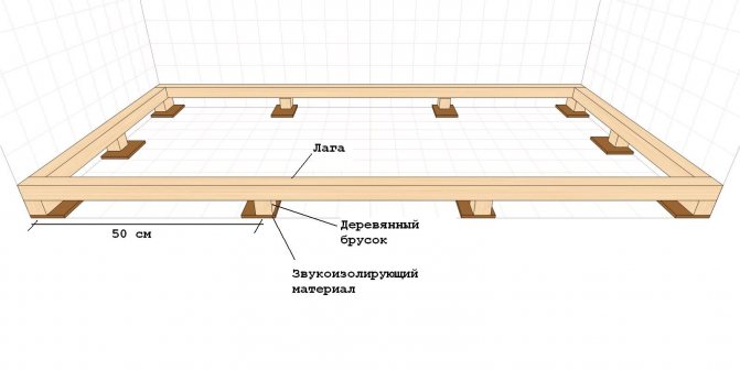 Върху хидроизолационния слой се полагат дървени греди. Разстоянието между съседните изоставащи греди (стъпало на закъснение) се определя от тяхното сечение, както и от носещата способност и твърдостта на покриващите подови слоеве - решетка, под, покритие Обикновено се предприема стъпка, която е удобна за полагане между трупите на стандартни плочи от изолация от минерална вата, около 600 мм.