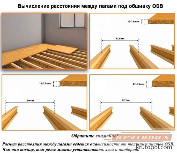 Изоставащите трябва да имат не само подходящо напречно сечение, но и достатъчна плътност. Ако направите стъпката на изоставане за пода на дъските твърде голяма, тогава дъските ще започнат да се огъват, "играят". По същия начин, ако разстоянието между изоставанията за пода на OSB е повече от допустимото, тогава плочите ще започнат да се рушат и да се напукват.