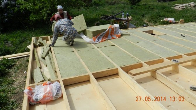 - Монтаж на топлоизолация. Изборът на технология за монтиране на изолация директно зависи от нейния тип. За рулонните материали (базалтова вата) е достатъчно материалът да се разнесе върху повърхността на основата. По време на работа е важно да се сведе до минимум размерът на пролуките между слоевете. Поради факта, че височината на изоставането често е 250 mm, могат да се монтират няколко слоя. Препоръчва се схемата да се разработи по такъв начин, че ставите на всяка следваща да не съвпадат с предишната. Това е необходимо, за да се предотврати появата на така наречените студени мостове - зони, където температурата ще бъде значително по-ниска, отколкото в основния топлоизолационен слой.