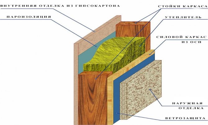 Изолацията на стените в рамкова къща е подобна. Залепваме изолацията между стълбовете на стената. Не забравяйте, че разстоянието между стълбовете също трябва да бъде с 20-30 мм по-голямо от ширината на изолацията. Обикновено разстоянието между стълбовете е 625 mm с 40 mm дъска и 635 mm с 50 mm дъска. Между другото, струва ми се, че е по-добре да изрежете OSB-3 няколко пъти, отколкото постоянно да режете изолацията.