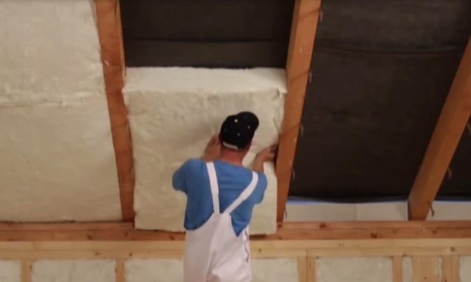 - Поставяне на изолация между изоставанията. Експертите препоръчват да се постави изолацията възможно най-плътно. Всички празнини са запечатани с уплътнител или пяна;