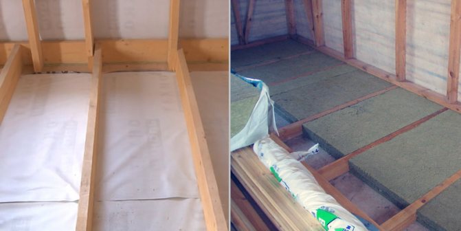 Изолацията от минерална вата се полага върху ветроустойчивия филм в оформения канал между трупите. Можете да направите без ветроустойчив филм, ако използвате специални изолационни плочи с уплътнен ветроустойчив слой за долния слой.