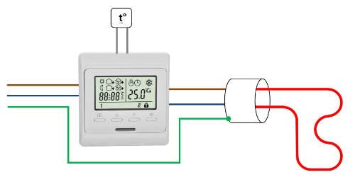 Както може да се види от схемата, от една страна, два импулсни проводника с напрежение 220 V AC се вписват в импровизирания „вход" към термостата. От друга страна, нагревателен кабел е свързан към „изхода". Температурен сензор присъства като система за обратна връзка, която трябва да определи момента, в който нагревателният елемент е включен. Понякога термостатът може да бъде оборудван с вграден сензор, който измерва температурата на въздуха. В нашия случай, както в повечето схеми с топъл под, като основен се използва външен температурен датчик. Външен сензор е или полупроводников сензор, или термодвойка, които променят съпротивлението си в зависимост от температурата.