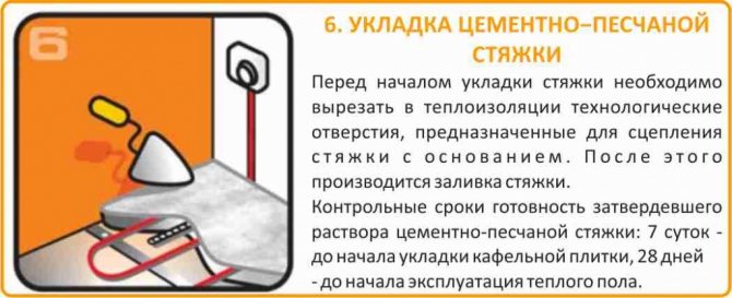 Времето, необходимо на бетона да изсъхне, е около 4 седмици. Ако е необходимо да се ускори изсъхването на пода, е позволено временно да се включи отоплението на водата с максимална температура 30 градуса.