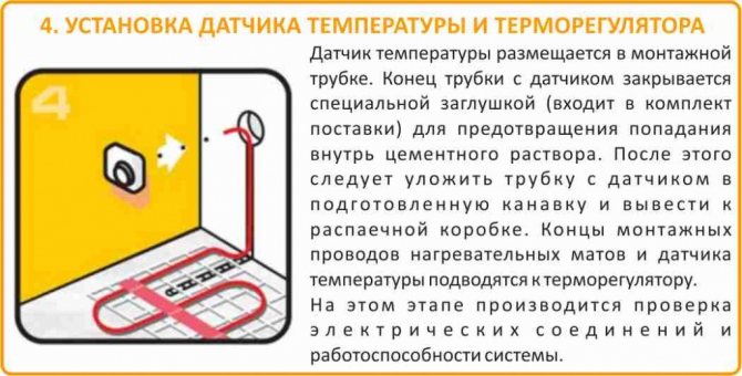 Температурният сензор е разположен в замазката вътре в гофрираната тръба. Невтвърденото лепило за цимент или плочки не трябва да влиза в контакт със сензора. Ако е необходимо, потребителят или ремонтникът трябва да могат да подменят оборудването, което е повредило термичния сензор.