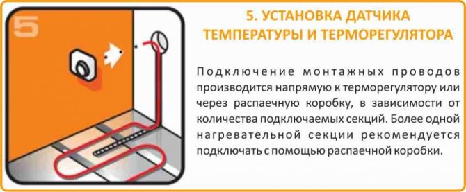 На етапа на свързване на електрическото подово отопление инсталацията му вече е извършена и интересуващите се краища от нагревателния кабел и термодвойката се водят към монтажната кутия. Разопаковаме термостата си, справяме се с метода на закрепване на кутията към монтажната кутия и виждаме към кои контакти трябва да бъдат свързани нашите проводници.