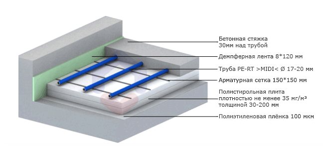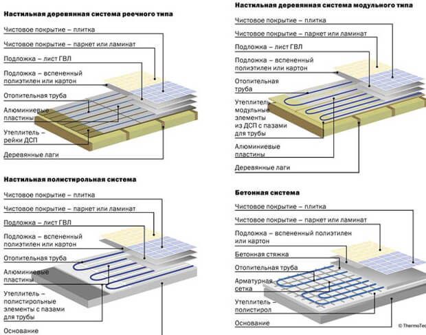 Но тук си струва да се обърне специално внимание на факта, че моделът на топлия под и припокриването на сградата влияят върху дизайна на тортата. Следователно, за да се избегнат грешки, всеки тип монтаж на отоплителната система трябва да бъде разгледан по-подробно.
