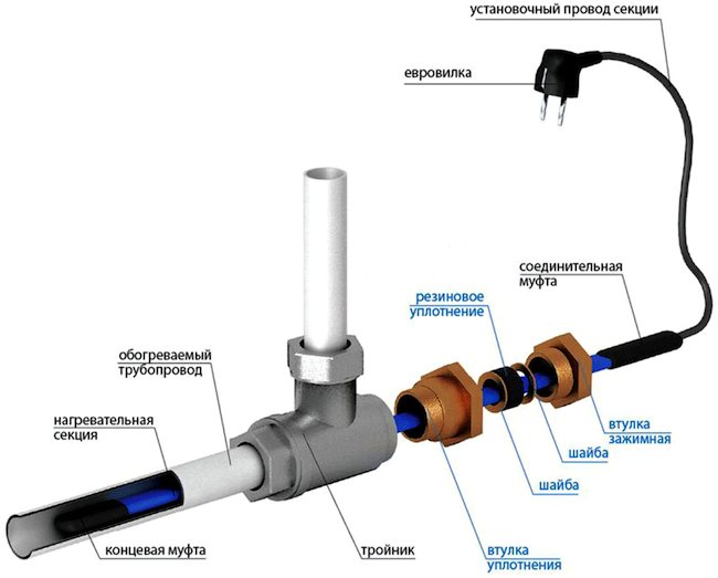 Тройникът за монтиране на нагревателния кабел вътре в тръбата може да има различни ъгли на изход - 180 °, 90 °, 120 °. При този метод на инсталиране проводникът не е фиксиран по никакъв начин. Той просто е пъхнат вътре.