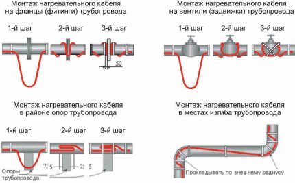 Отделни елементи от този вид (и те включват различни кранове, опори, фланци и т.н.) трябва да бъдат обвити с голямо количество нагревателен кабел, тъй като разсейването на топлината в такива възли е много по-голямо.Можете да намерите всички необходими схеми за инсталиране на изображението по-долу.